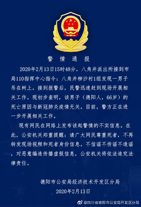 對此,13日22時53分,四川省德陽市公安局經濟技術開發區分局官方微博發佈警情通報闢謠稱:現初步查明,該男子死亡原因與新冠肺炎疫情無關。