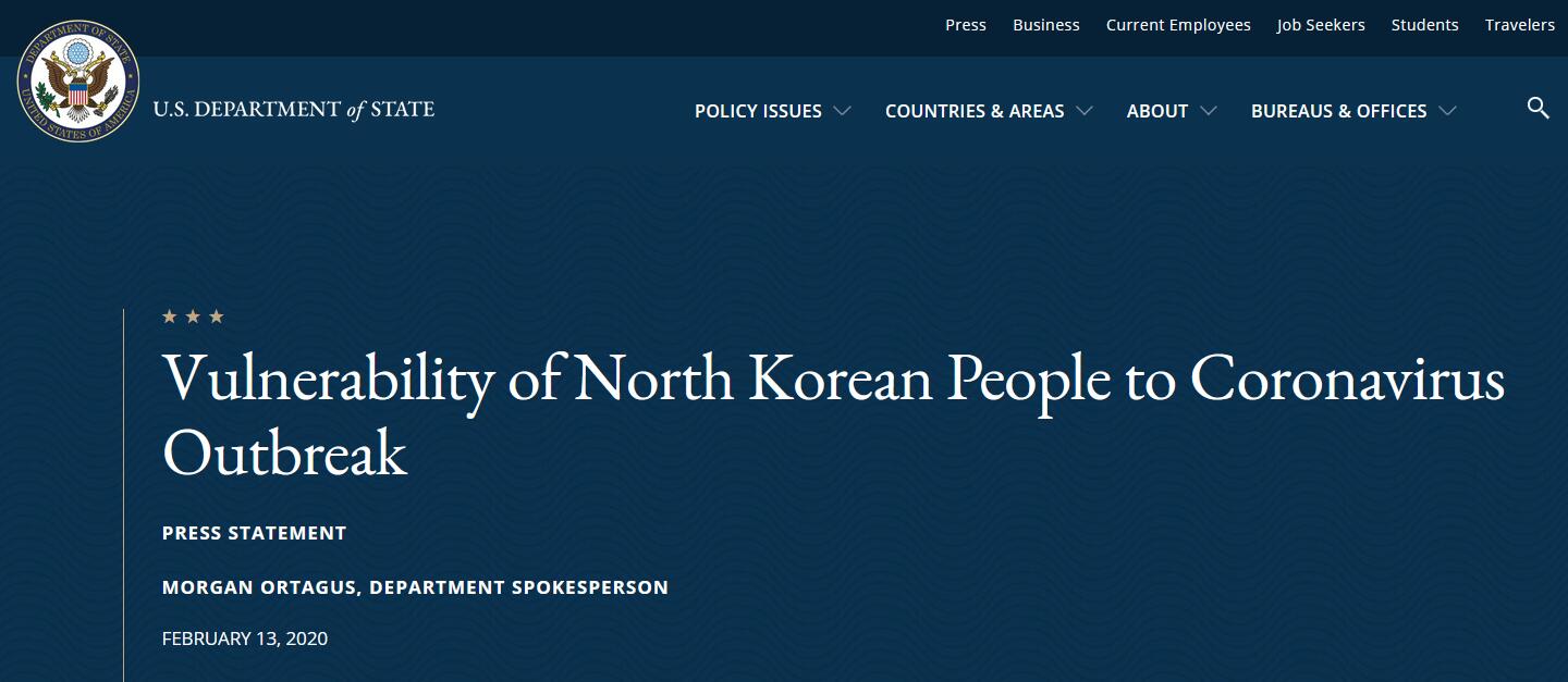 【文/觀察者網 谷智軒】當地時間2月13日,美國國務院發言人摩根•奧塔格斯(Morgan Ortagus)發表聲明稱,對於朝鮮民眾在面對新型冠狀病毒爆發時的脆弱性,美方深表關切。我們強烈支持和鼓勵美方和國際社會的援助,以及各衞生組織應對和控制新型冠狀病毒在朝鮮傳播的相關工作。美國已經準備好迅速批准這些組織提供的援助。