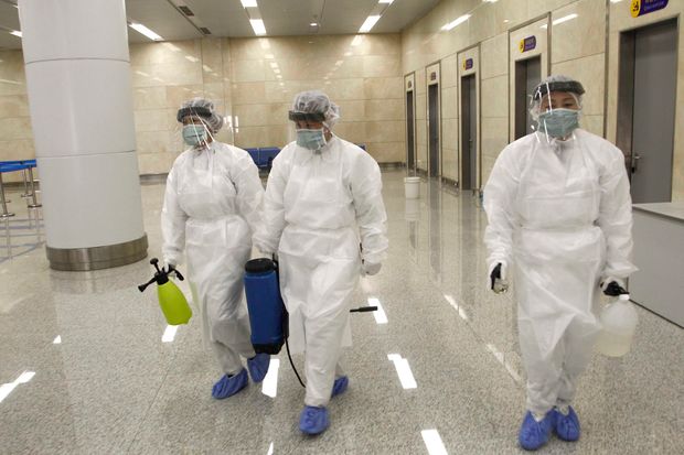 帶着防護裝備和消毒劑的官員準備在平壤國際機場檢查從國外入境旅客的健康狀況 圖自美媒