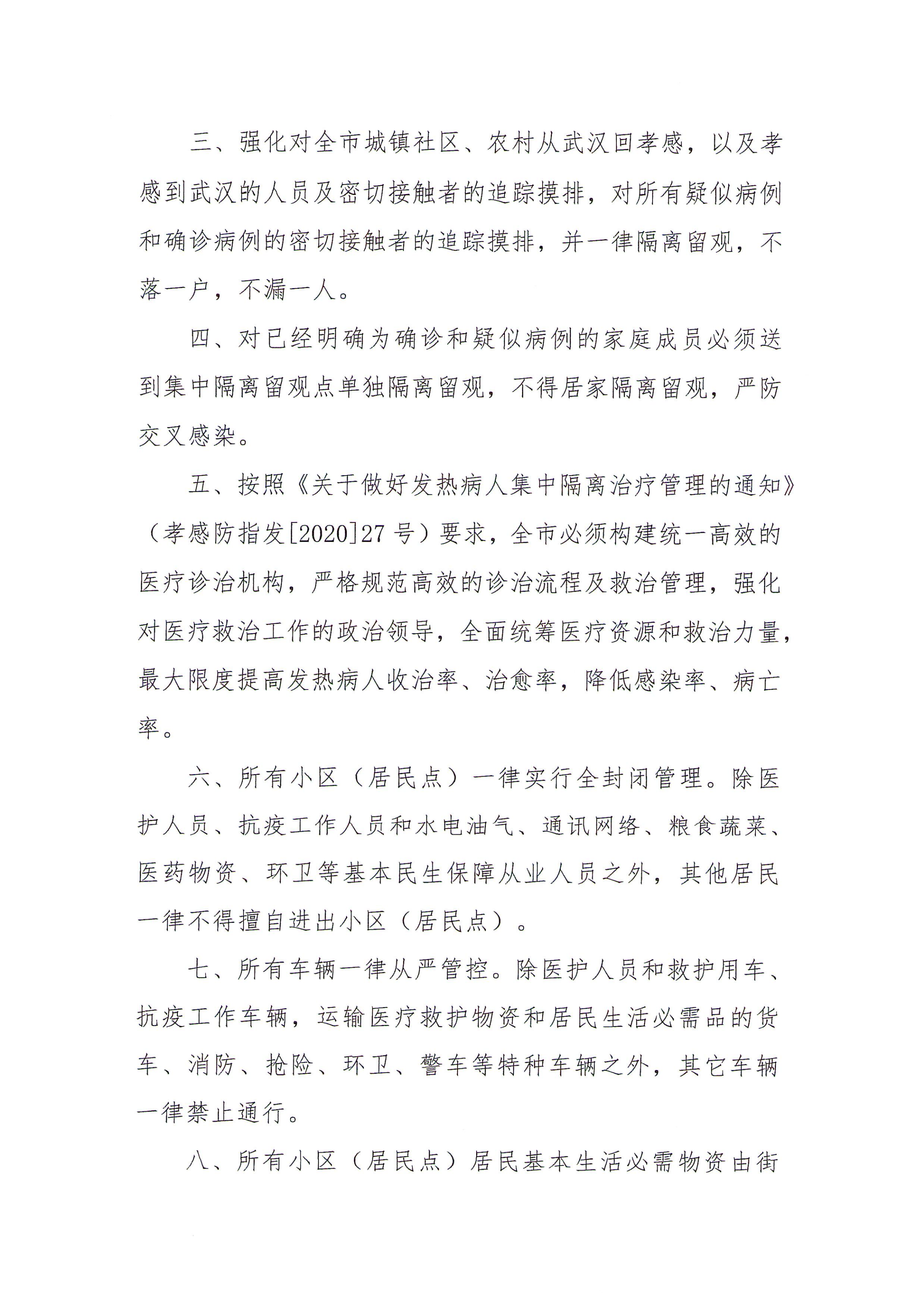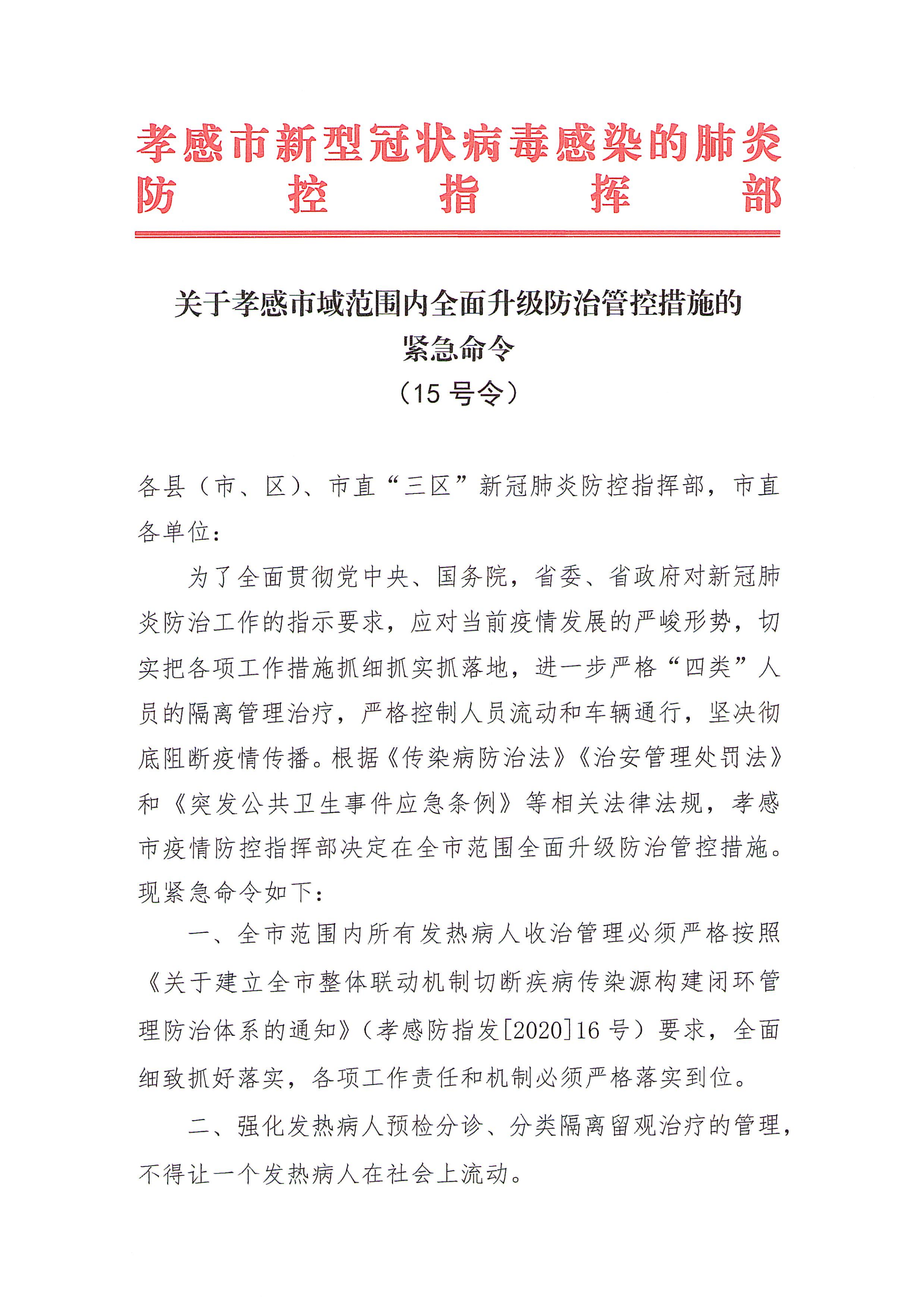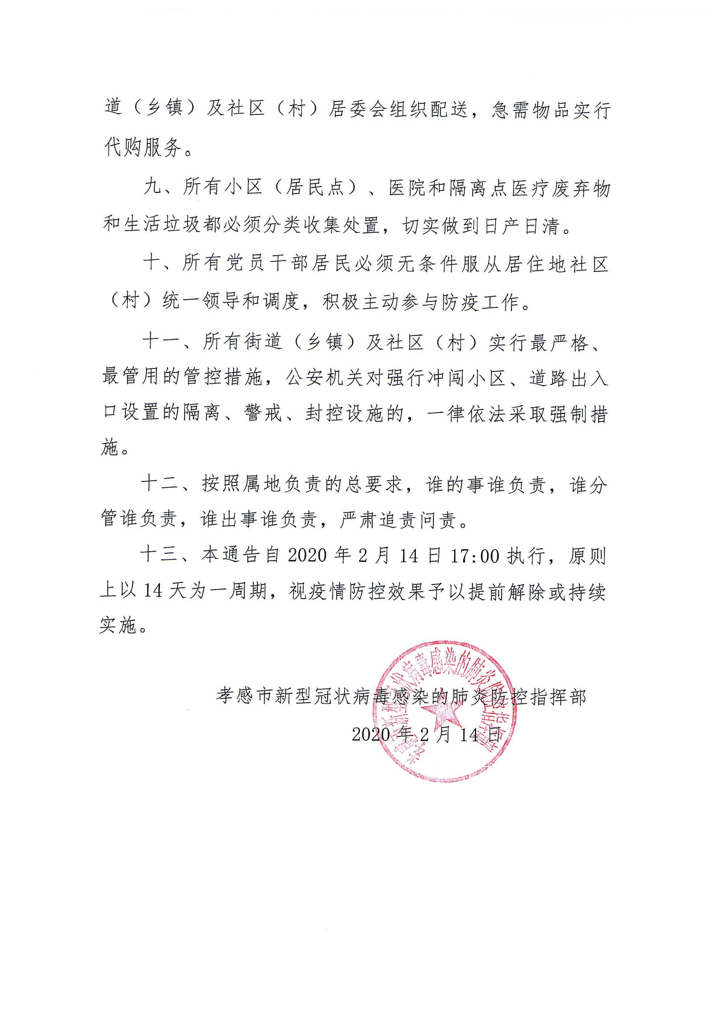 據孝感市人民政府網站2月14日消息,孝感市新型冠狀病毒感染的肺炎防控指揮部當天發佈市域範圍內全面升級防治管控措施的緊急命令(15號令),要求所有小區(居民點)一律實行全封閉管理;所有車輛一律從嚴管控;所有小區居民基本生活必需物資由街道(鄉鎮)及社區(村)居委會組織配送,急需物品實行代購服務。