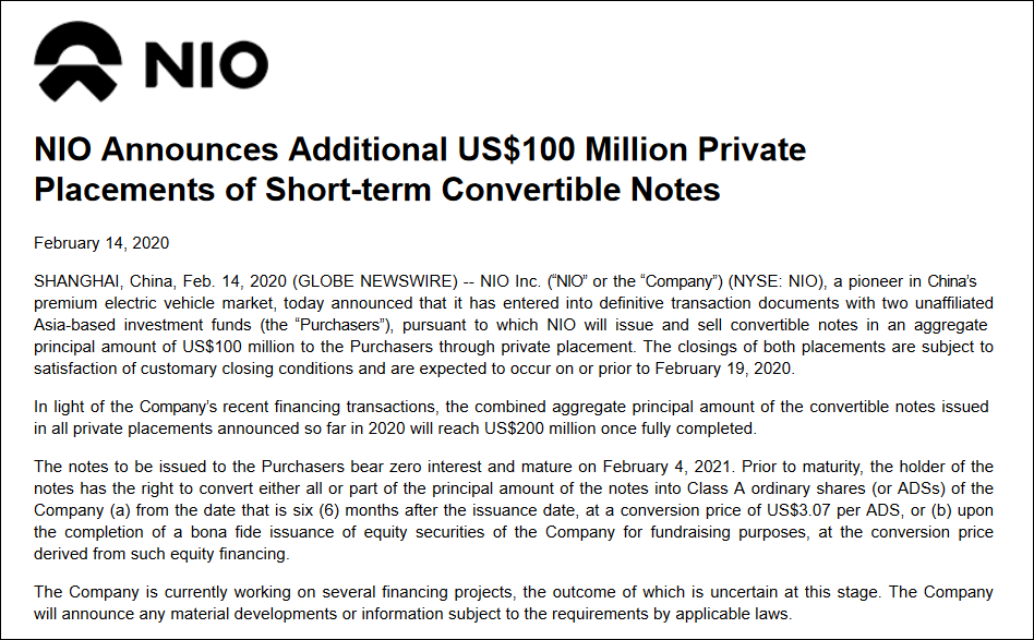 2月14日,蔚來宣佈與兩家與其無關聯關係的亞洲投資基金簽訂了可轉換債券認購協議。根據協議,蔚來將以非公開發行的方式向購買方發行和出售本金總額1億美元(約合人民幣6.98億元)的可轉換債券,交易將於2月19日完成。向購買方發行的債券利率為零,將於2021年2月4日到期。