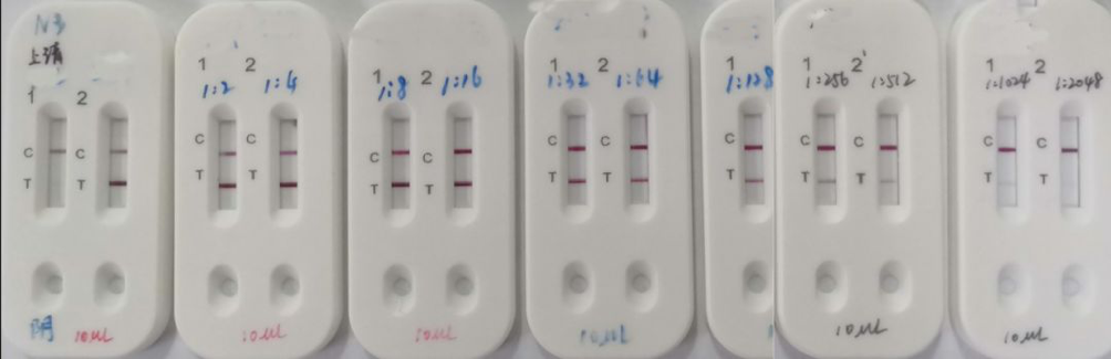 △從左至右為一位新型冠狀病毒感染者的血樣稀釋至1:512倍後仍可被本試劑盒檢出