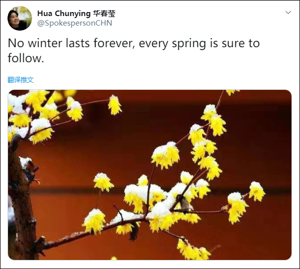 在華春瑩發佈的第一條推特中,她寫道,“寒冬總會過去,春天必將到來!”配圖是在寒冬中盛開的梅花。
