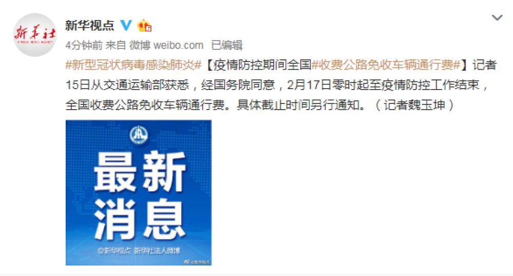 疫情防控期間全國收費公路免收車輛通行費 2020-02-15 新型冠狀病毒感染肺炎【疫情防控期間全國收費公路免收車輛通行費】記者15日從交通運輸部獲悉,經國務院同意,2月17日零時起至疫情防控工作結束,全國收費公路免收車輛通行費。具體截止時間另行通知。(記者魏玉坤) ↑新華視點微博