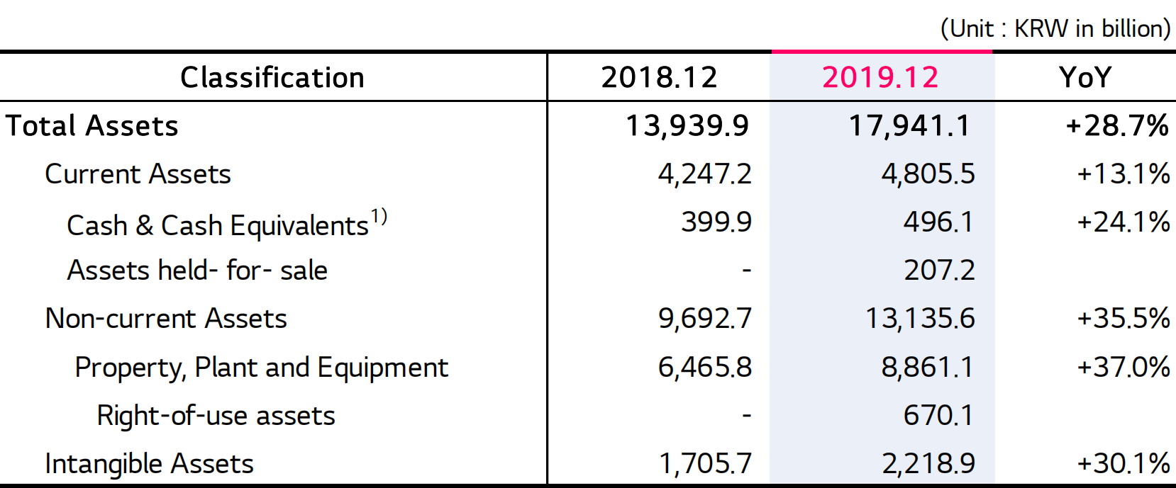 到了2019年底,LG U+總資產膨脹近4萬億韓元,逼近18萬億韓元,漲幅近29%。其中,固定資產增幅超35%,“物業、廠房、設備”(下稱:PP&E)一類固定資產的增幅超過37%。