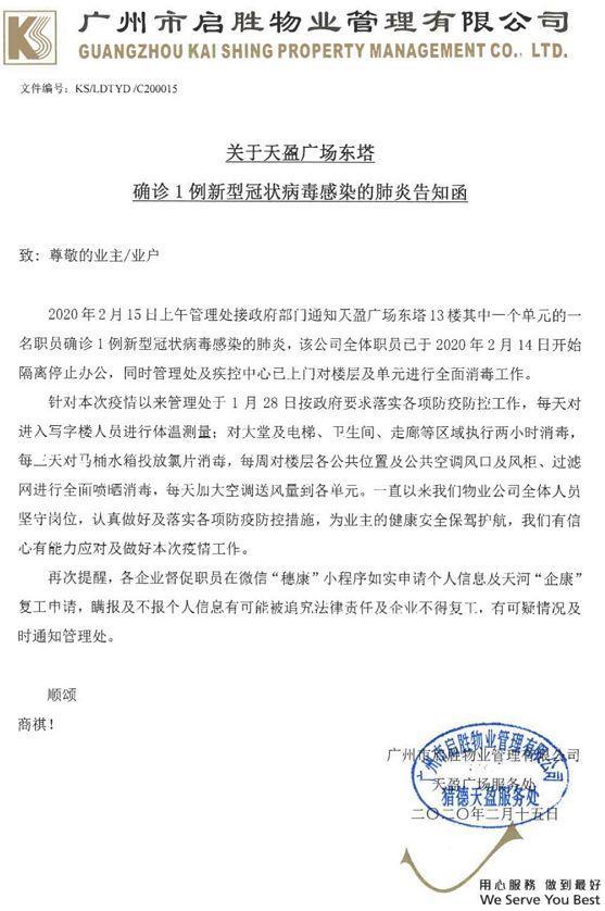 廣州啓勝物業管理有限公司發佈的告知函顯示,2月15日上午,啓勝物業管理處接到政府部門通知天盈廣場東塔13樓其中一個單元的一名職員,確診感染了新型冠狀病毒肺炎。