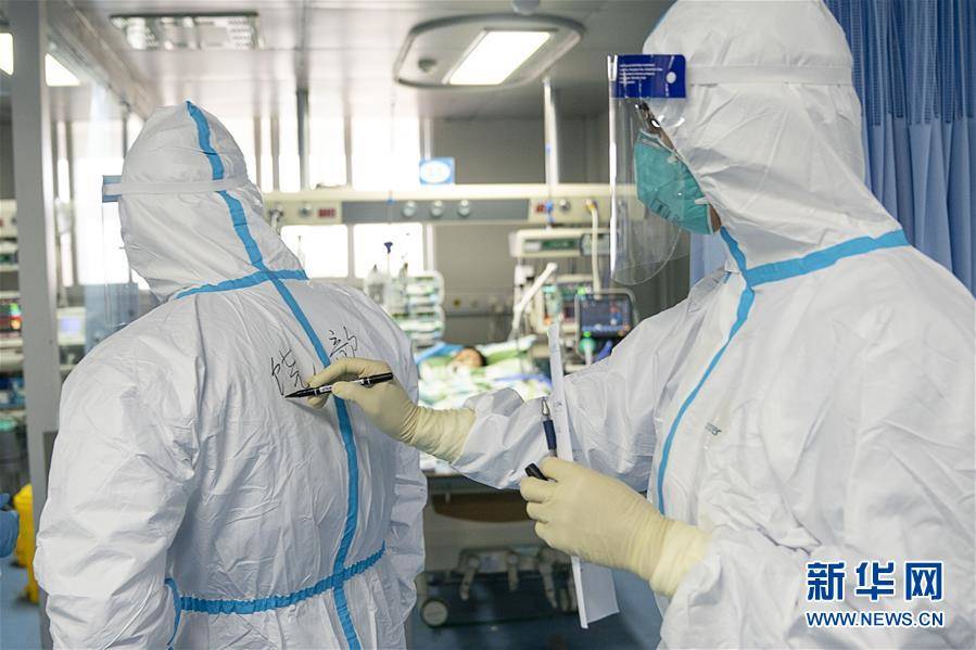 1月24日,在武漢大學中南醫院重症隔離病房內,醫護人員在隔離服外寫下名字,方便相互辨認。 新華社記者 熊琦 攝