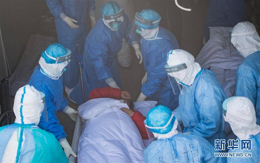 1月24日,武漢大學中南醫院重症隔離病房的醫護人員將一名好轉的病人轉移至普通隔離病房。 新華社記者 熊琦 攝