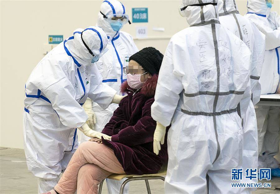 2月10日,在武漢客廳方艙醫院,醫護人員在安撫一名因精神壓力過大而哭泣的患者。 新華社記者 熊琦 攝