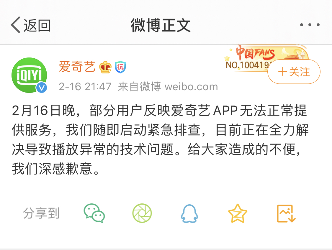 2月16日晚,部分用户反映愛奇藝APP無法正常提供服務,我們隨即啓動緊急排查,目前正在全力解決導致播放異常的技術問題。給大家造成的不便,我們深感歉意。