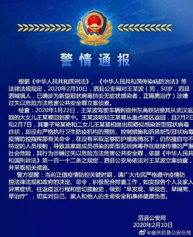 據瞭解,犯罪嫌疑人王某某系宿州市泗縣某機關工作人員,且參與防疫工作。1月22日,王某某駕駛車輛到宿州東高鐵站接其從武漢返鄉的大女兒王某甲回到家中,對王某甲從重點疫區返回的情況一直隱瞞。2月5日,社區工作人員走訪排查發現王某甲的武漢返鄉史情況後,王某某仍未將情況上報。在2月2日和2月7日其妻子常某某和小女兒王某乙相繼出現疑似感染新型冠狀病毒症狀後,才於2月8日上報王某甲返鄉情況。