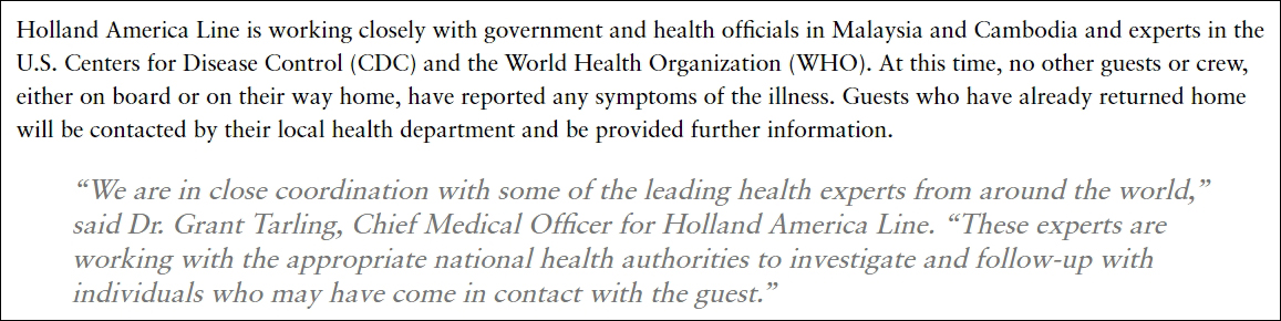 荷美公司首席醫療官格蘭特·塔林説,“我們正與世界各地的頂尖醫療專家密切合作。他們會配合相關國家衞生部門調查並追蹤可能與這名客人(患者)接觸的旅客。”