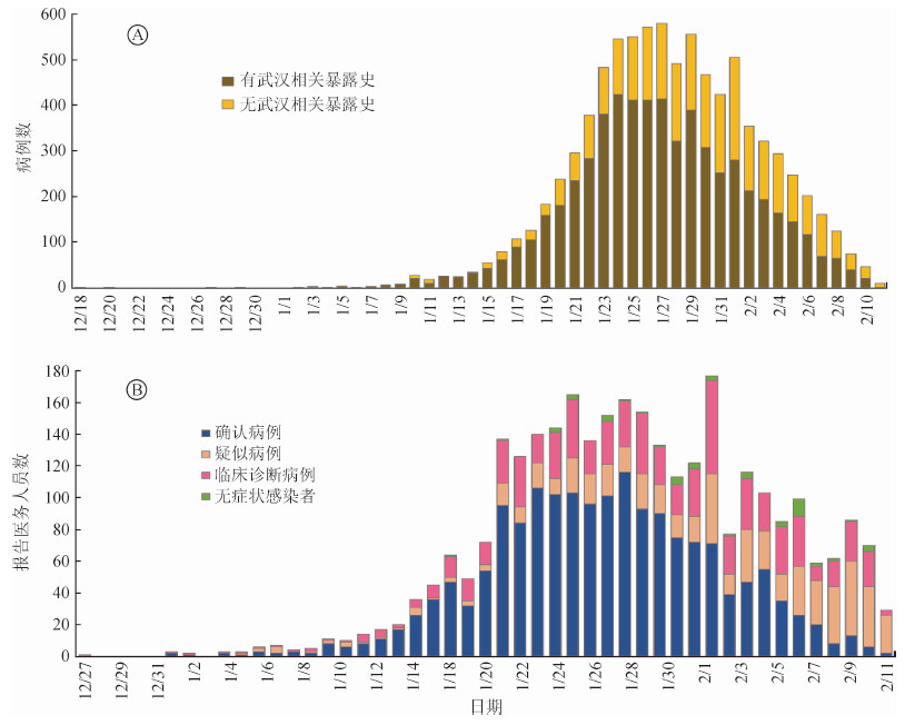 截至2020年2月11日湖北以外新型冠狀病毒肺炎確診病例有無武漢暴露史及醫務人員病例按照發病日期分佈