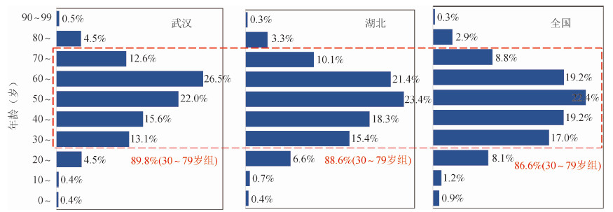 患者集中在30-79歲,該年齡組佔確診病例總數比例武漢市為89.8%,湖北省(包括武漢)為88.6%,全國(包括湖北)為86.6%。60歲以上的老年組病例數佔比,武漢為44.1%,湖北(包括武漢)為35.1%,全國(包括湖北)為31.2%。