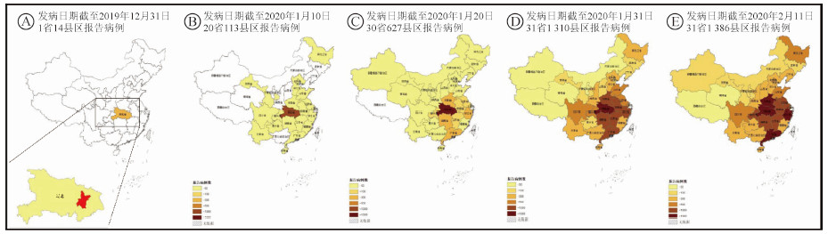截至2月11日,全國31個省份的1386個縣區共報告44672例確診病例(湖北佔74.7%),其中,有0.2%的病例發病日期在2019年12月31日之前,病例均在湖北;有1.7%的病例發病日期在1月10日之前,分佈在20個省份的113個縣區,其中湖北佔88.5%;有13.8%的病例發病日期在1月20日之前,分佈在30個省份的627個縣區,其中湖北佔77.6%;有73.1%的病例發病日期在1月31日之前,分佈在31個省份的1 310個縣區,其中湖北佔74.7%。