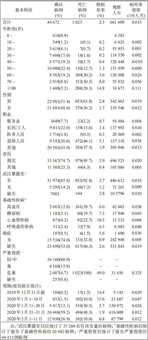 共報告72314例病例,其中,確診病例44672例(61.8%),疑似病例為16186例(22.4%),臨牀診斷病例10 567例(14.6%),無症狀感染者889例(1.2%)。確診病例的基本特徵中,大多數年齡在30-69歲之間(77.8%),51.4%為男性,農民或工人佔22.0%,湖北省佔74.7%,80.9%屬於輕/中症。