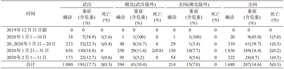 對1688名有病情嚴重程度的確診病例進行分析,武漢有1080例,佔全國醫務人員發病總數64.0%,湖北除武漢外的其他地區394例(佔23.3%),除湖北外全國其他30個省(區/市)214例(12.7%)。重症比例在武漢為17.7%,湖北10.4%,全國除去湖北外為7.0%。按照不同時段,武漢醫務人員重症比例從最高時38.9%,逐漸下降,到2月上旬12.7%。