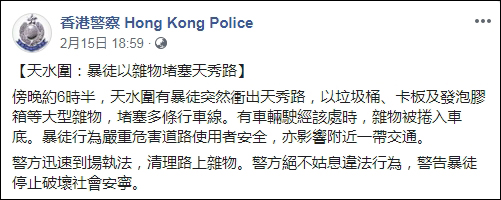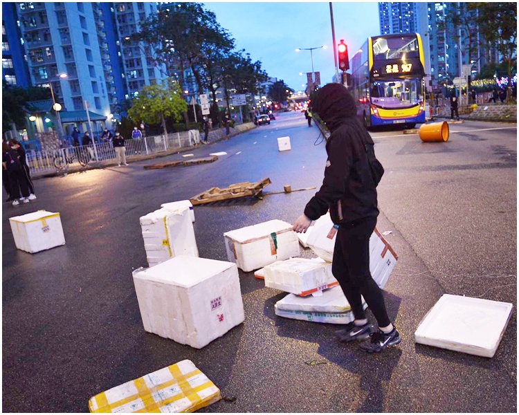 晚上約6時半,有示威者突然衝出天秀路,用垃圾桶、卡板及發泡膠箱等大型雜物堵塞多條車道。