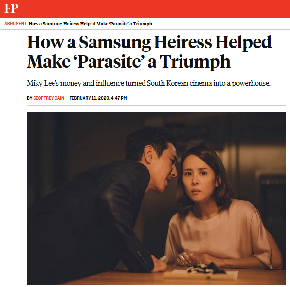 奧斯卡頒獎典禮結束後,在場的許多西方人不太清楚為什麼觀眾席上一位低調的韓國婦女會被人們包圍。這個叫李美敬的女人是韓國電影產業的伯樂,她是三星財閥創始人李秉喆的孫女、CJ集團的副會長,該集團旗下負責影視的子公司CJ娛樂製作了《寄生蟲》以及其它很多獲獎的韓國電影作品。在今年三月面世的拙作《三星升起》中,我對她的生平有更詳細的介紹。