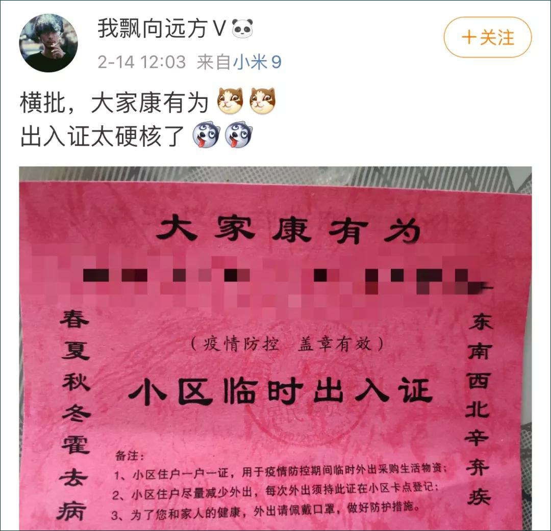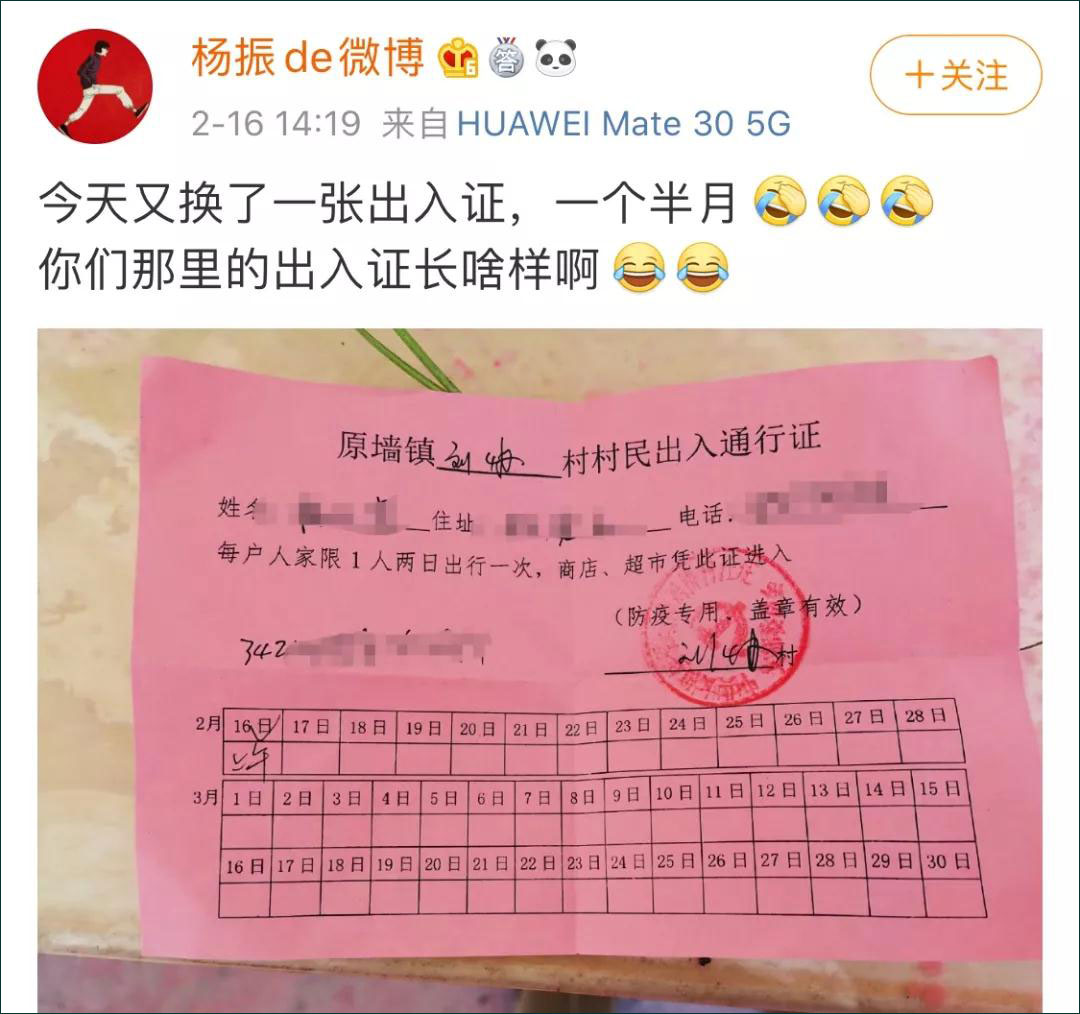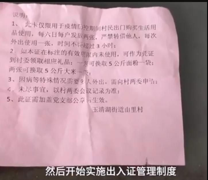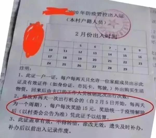 山東濟南一村莊將出入證加入了獎勵制度,每户3天一張出入證,如果6天村民沒有外出,則可以兑換米和麪。