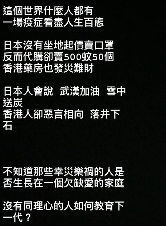 “日本人會説武漢加油,雪中送炭,香港人卻惡言相向,落井下石。不知道那些幸災樂禍的人是否生長在一個欠缺愛的家庭,沒有同理心的人如何教育下一代?”