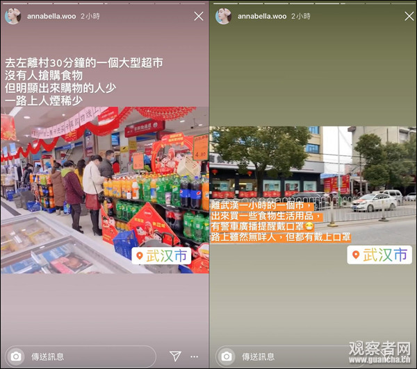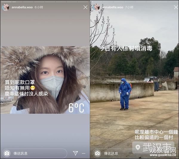 從社交媒體發佈的時間來看,胡淽喬1月19日就已經到達了武漢,年初一(25日)發了條貼文向粉絲們報平安後,稱自己正在武漢一農村中居家進行防疫措施,暫時不會有回到香港的安排。
