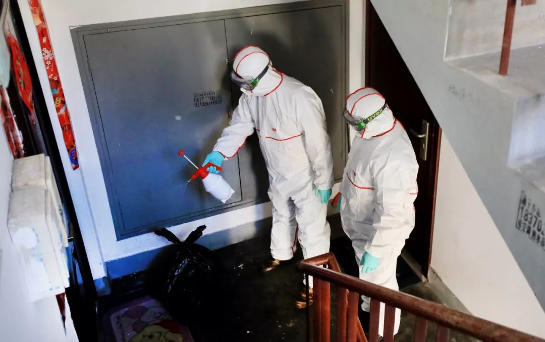 2月17日,上海市黃浦區五里橋街道申傑物業公司工作人員對已經封裝好的居家隔離居民生活垃圾噴灑消毒水。新華社記者 方喆 攝