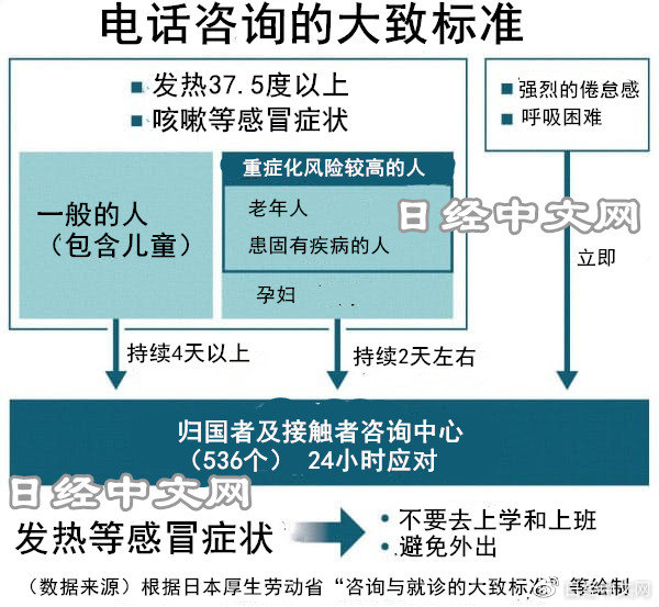 為了避免有感冒症狀的人蜂擁而至醫療機構的事態,政府設置了電話諮詢中心。諮詢中心如果認為可能感染,將向患者介紹專業門診。設有專業門診的醫療機構名稱不對外公開。