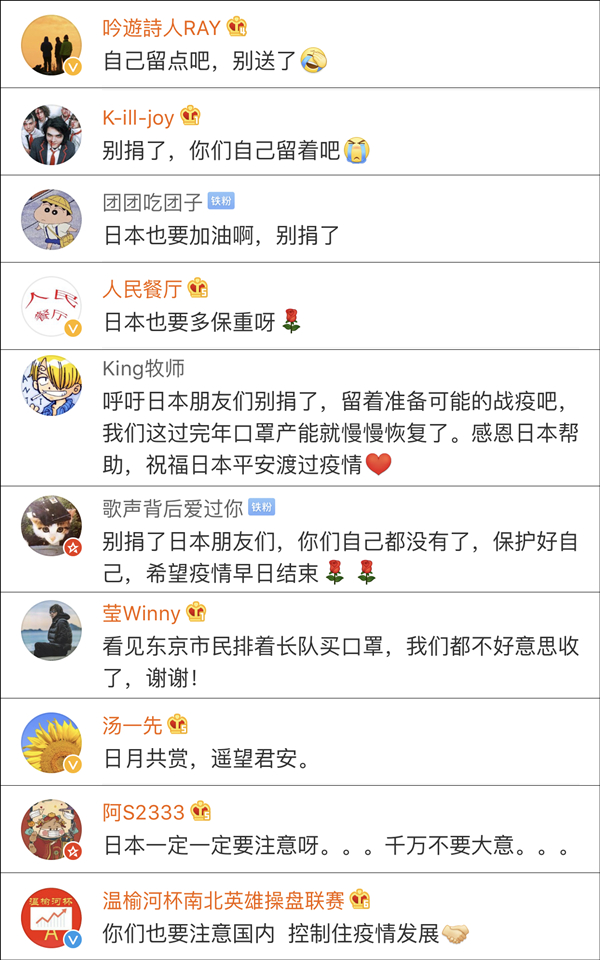 可這回中國網友們的反應卻變了樣,眼瞅日本也在逐漸遭病毒攻擊,大家清一色地勸着:我們心領了,別捐了,你們自己留點吧……