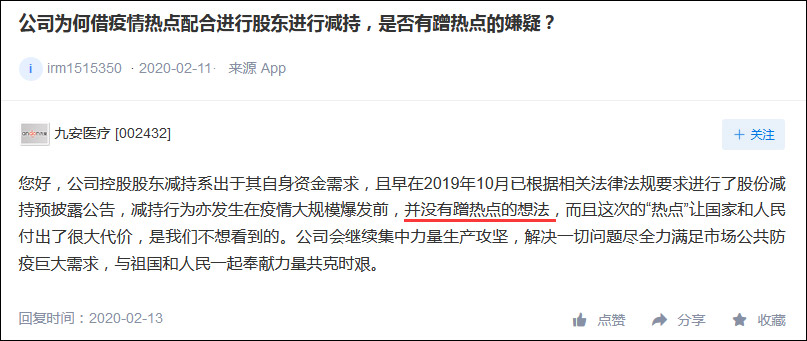 對此,九安醫療回覆稱:“公司控股股東減持系出於其自身資金需求,且早在2019年10月已根據相關法律法規要求進行了股份減持預披露公告,減持行為亦發生在疫情大規模爆發前,並沒有蹭熱點的想法。”