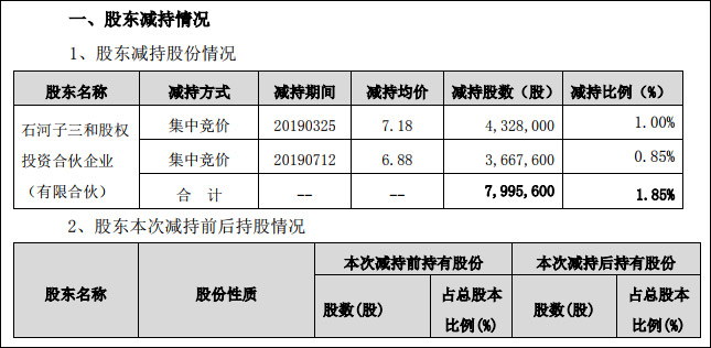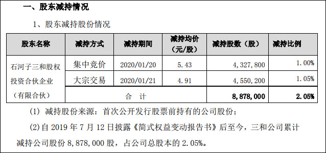 1月22日,九安醫療發佈公告,三和公司已於2020年1月20日-21日以大宗交易和集中競價方式減持887.8萬股,佔該公司總股本的2.05%,且減持計劃涉及的集中競價方式減持數量已過半。減持後,三和公司持股比例由33.43%降至31.38%。