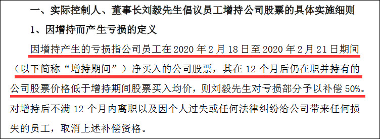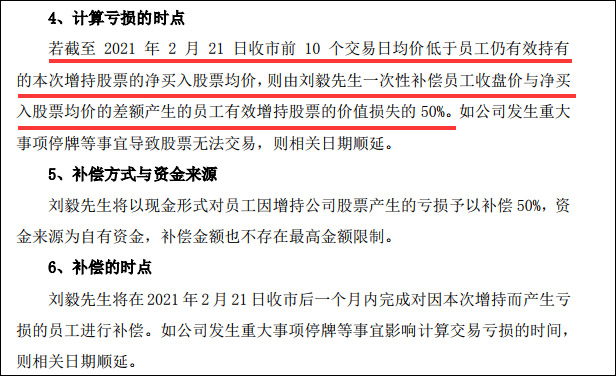 上述公告中提到,劉毅將以現金形式對員工因增持產生的虧損予以補償,資金來源為自有資金,補償金額也不存在最高金額限制,補償時間點為2021年2月21日收市後一個月內。