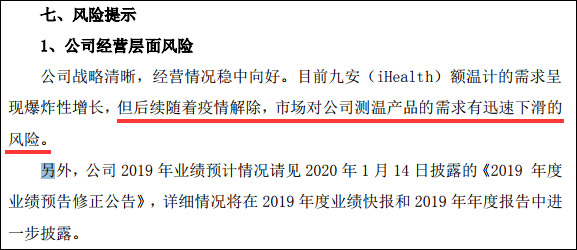 在前文倡議員工增持的公告中,九安醫療還提到,其經營情況穩中向好。“目前九安(iHealth)額温計的需求呈現爆炸性增長,但後續隨着疫情解除,市場對公司測温產品的需求有迅速下滑的風險。”