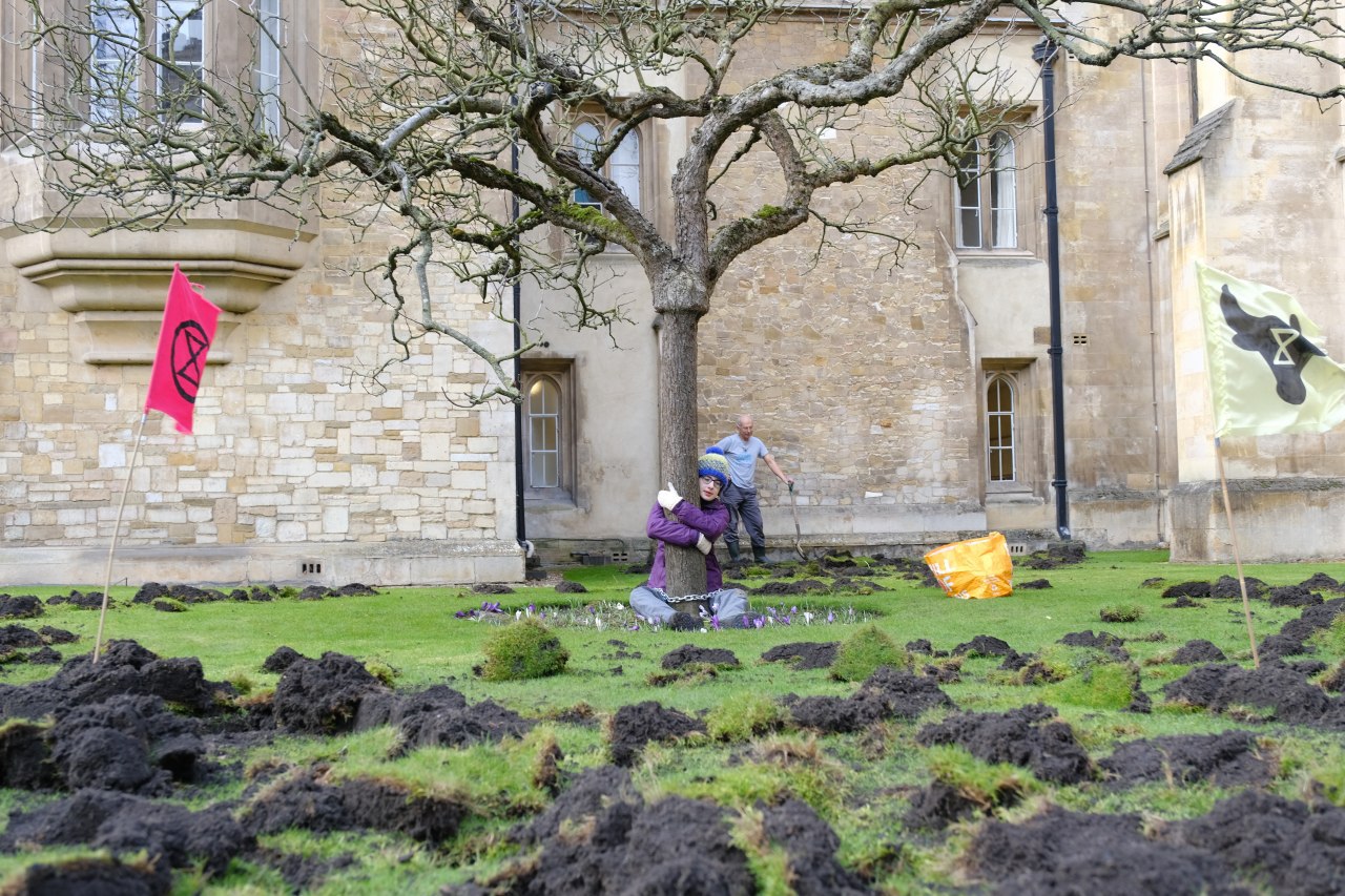 與此同時,示威者們闖入劍橋大學展開抗議活動,他們將目標對準劍橋大學內最有名,也是財力最為雄厚的三一學院(Trinity College)。現場圖顯示,示威者挖開了三一學院內的草坪,並插上“反抗滅絕”組織的旗幟。還有一人,將自己綁在了草坪上的一棵蘋果樹邊。