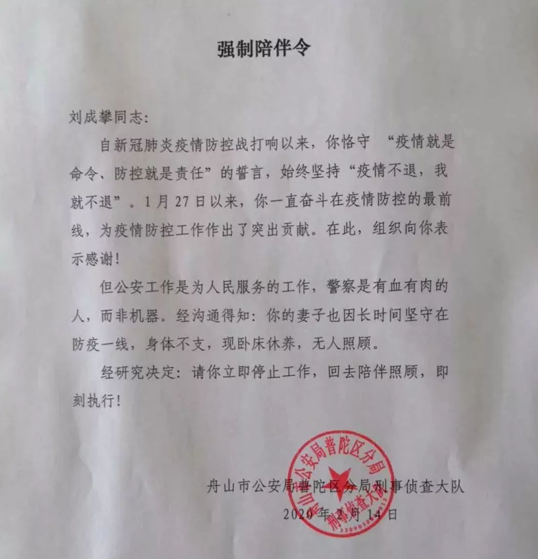 2月14日,舟山市公安局普陀區分局刑事偵查大隊技術室民警劉成攀,收到了一張《強制陪伴令》,被責令強制陪伴生病在家的妻子。