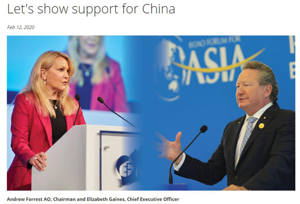 澳大利亞第三大鐵礦石企業福特斯克金屬集團(Fortescue Metals Group)總裁安德魯·福雷斯特與首席執行官伊麗莎白·蓋恩斯日前在《西澳大利亞人報》發表署名文章《讓我們對中國表示支持》,強調新冠肺炎疫情是全球挑戰,澳大利亞應感謝中國作出的犧牲,竭盡全力支持中國,並相信中國人民定能戰勝新冠肺炎疫情。