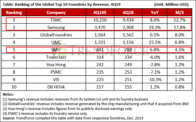 市場調研調研機構TrendForce的數據顯示,2019年第四季度全球半導體代工市場中,台積電市佔率達52.7%,三星為18.7%。