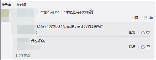 有網友稱:“(驍龍)865會不如855+?果然是娛樂大師”、“娛樂大師名不虛傳”;也有網友指出:“(驍龍)865的主頻率比855plus低,估計為了降低功耗。”