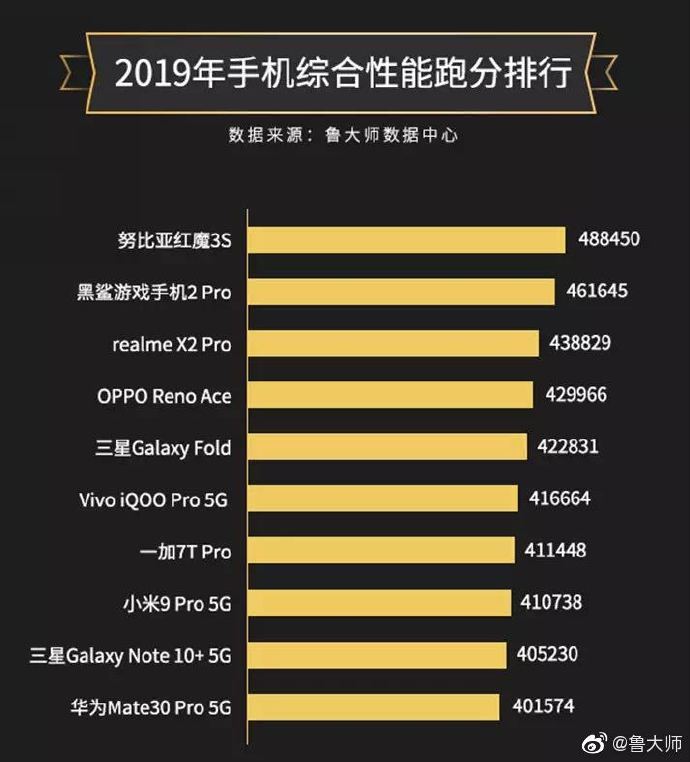 雖然上述手機綜合水平達到了頂級水平,但在魯大師同時放出的2019年手機綜合性能跑分排行上,居首的努比亞紅魔3S得分488450分,較小米10 Pro高出近4%。