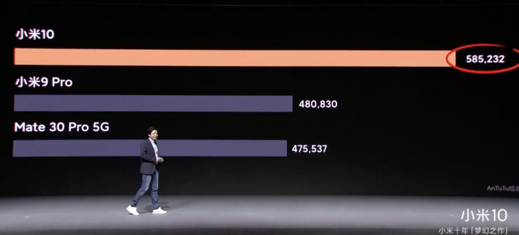 此前,在2月13日下午的小米10系列發佈會上,雷軍公佈了小米10安兔兔跑分,總分達到了585232分,較小米9 Pro性能高逾20%。