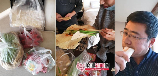除了來自山東老鄉帶來的家鄉情誼,臨沂第一批援鄂醫療隊還收到了熱心黃岡市民送來的自制山東雜糧煎餅,就着大葱和麪醬,一行人在宿舍裏吃得眼淚汪汪。