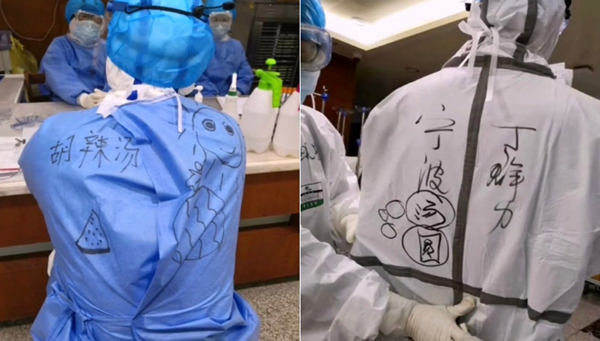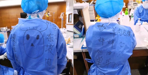 有的醫護人員們還將自己想吃的家鄉美食寫在了防護服上: