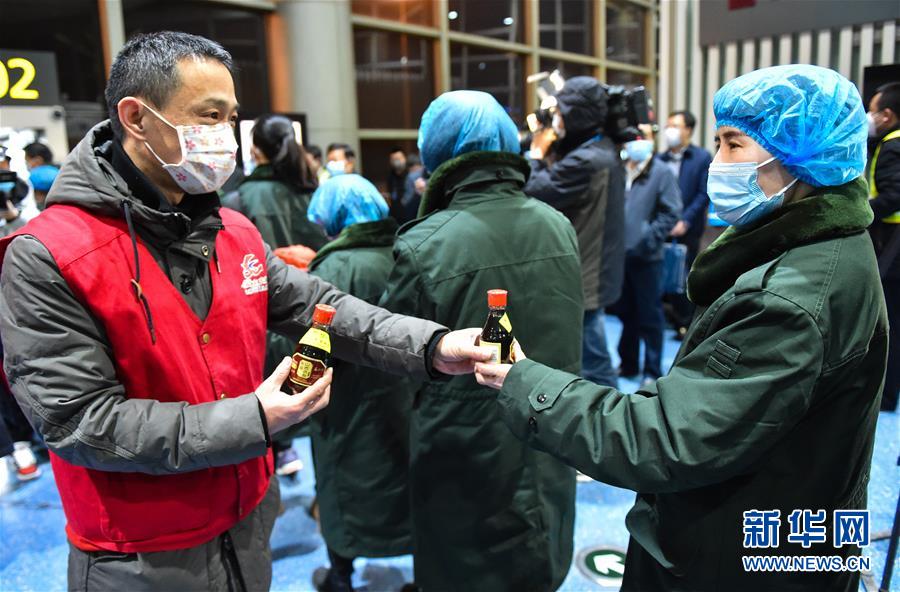 山西第十批支援湖北醫療隊在太原武宿機場,人手一瓶陳醋。