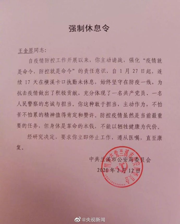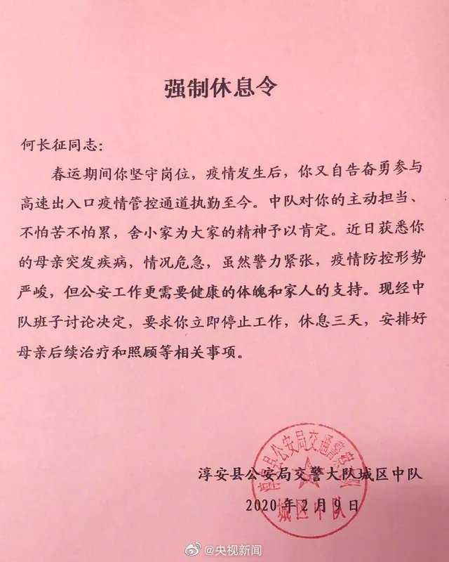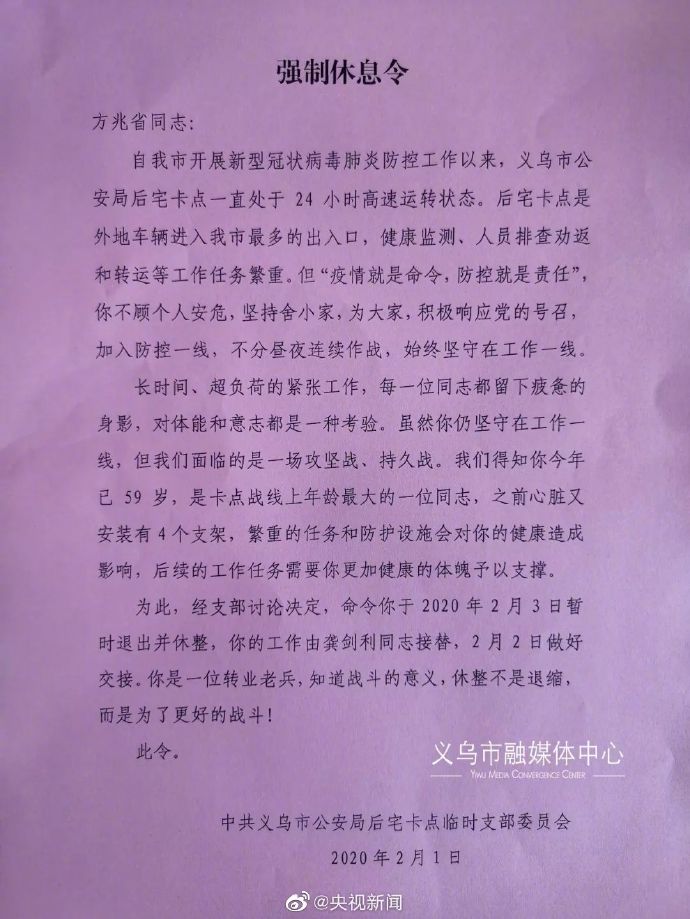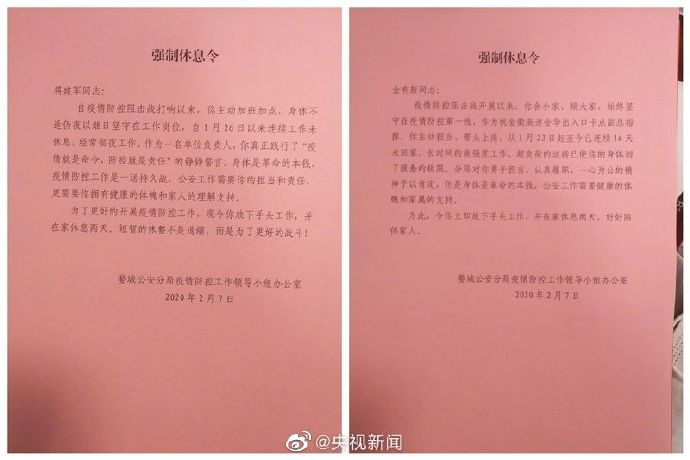 近日,一張張各地向抗疫一線人員發佈強制休息令的照片衝上微博熱搜,令網友轉發之餘淚目:辛苦了,請立即執行!