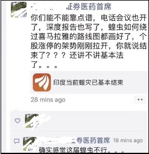 某證券醫藥首席在朋友圈吐槽;“你們能不能靠點譜,電話會議也開了,深度報告也寫了,蝗蟲如何繞過喜馬拉雅的路線圖都畫好了,個股漲停的架勢剛剛拉開,你就説結束了?還講不講法了?”
