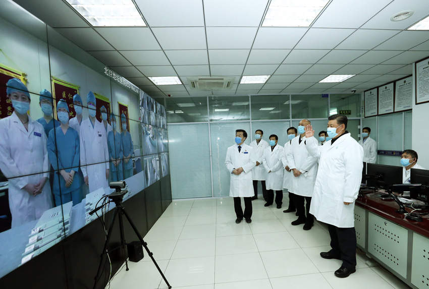 在地壇醫院遠程診療中心,習近平通過視頻連線武漢市收治新冠肺炎患者的金銀潭醫院、協和醫院、火神山醫院,向疫情防控一線的醫務工作者瞭解情況、聽取意見和建議。