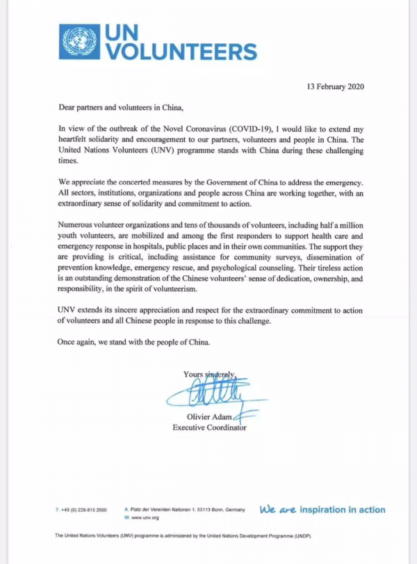 在聲明中,聯合國志願人員組織表示讚賞中國政府為抗擊疫情采取的全面應對措施,讚揚中國人民萬眾一心、團結一致,表示聯合國志願人員組織堅定地與中國站在一起。在聲明中,聯合國志願人員組織對參加抗擊疫情的全體志願者表示尊重和欽佩。充分肯定廣大志願者走進醫院、走進社區,在防控宣傳、緊急救助和心理輔助等領域發揮了重要作用,體現了奉獻、責任和主人翁精神。長期以來,中國青年志願者協會與聯合國志願人員組織開展了多方面多層次的豐富合作,保持着緊密聯繫和良好互動。近年來,雙方共同推動了“中國青年志願者海外服務計劃——服務聯合國機構”等合作項目,首批中國青年志願者已陸續派往包括聯合國總部在內的多個聯合國機構。