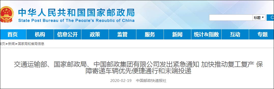據中華人民共和國國家郵政局官網消息,2月19日,交通運輸部、國家郵政局、中國郵政集團有限公司發出緊急通知,要求加快推動復工復產、保障郵政快遞車輛優先便捷通行、切實保障末端投遞、加強一線從業人員防護,更好支撐疫情防控、物資運轉、經濟秩序恢復和保障人民羣眾生產生活需要。以下為通知全文: