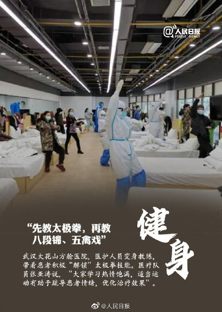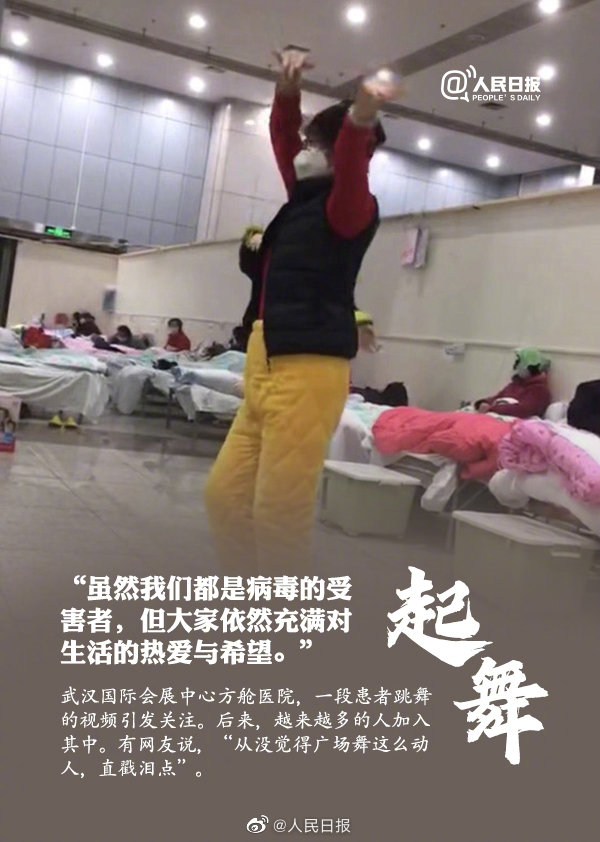 據@人民日報,近日,武漢方艙醫院裏跳廣場舞的視頻刷屏,患者的樂觀,打動很多人。與病毒較量的日子並不輕鬆,但他們依然認真生活,讀書、備考、演小品、拼魔方…#方艙醫院裏的生活#比想象中更豐富。有人説:從他們身上,看見了一座城的希望。祝福他們,早日康復!