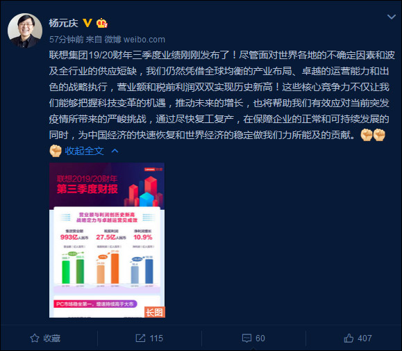 財報發佈後,聯想集團董事長楊元慶也在個人微博曬出業績並稱,將通過儘快復工復產,在保障企業的正常和可持續發展的同時,為中國經濟的快速恢復和世界經濟的穩定作出力所能及的貢獻。